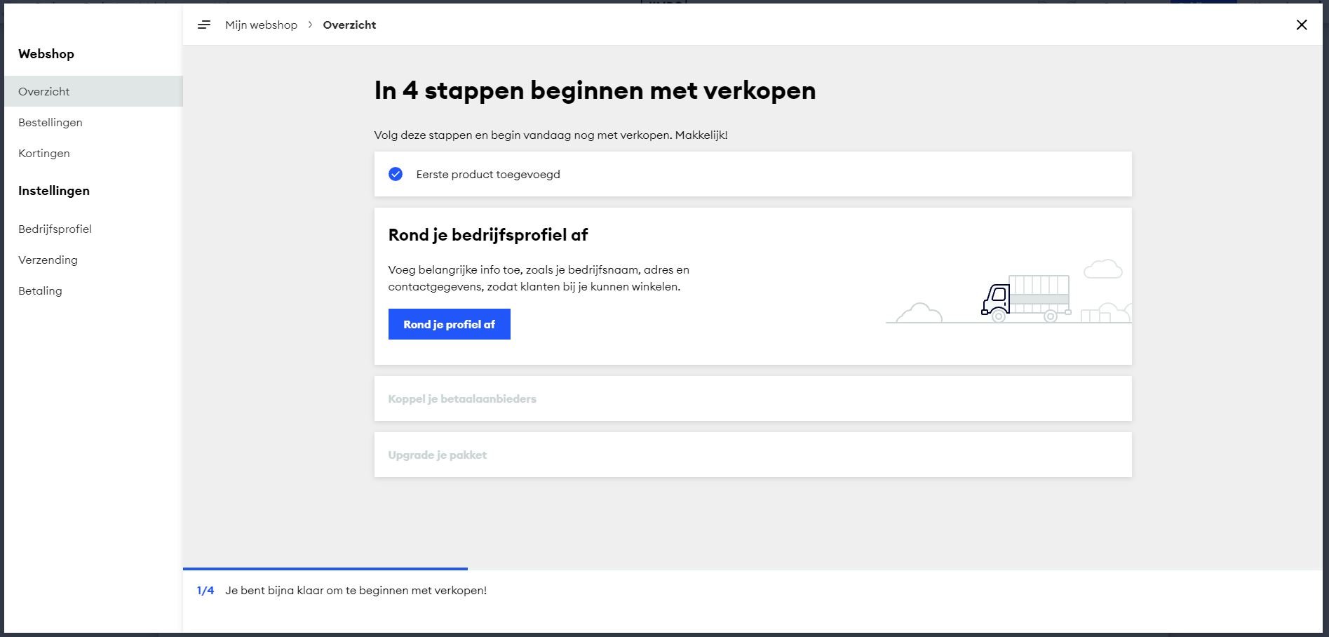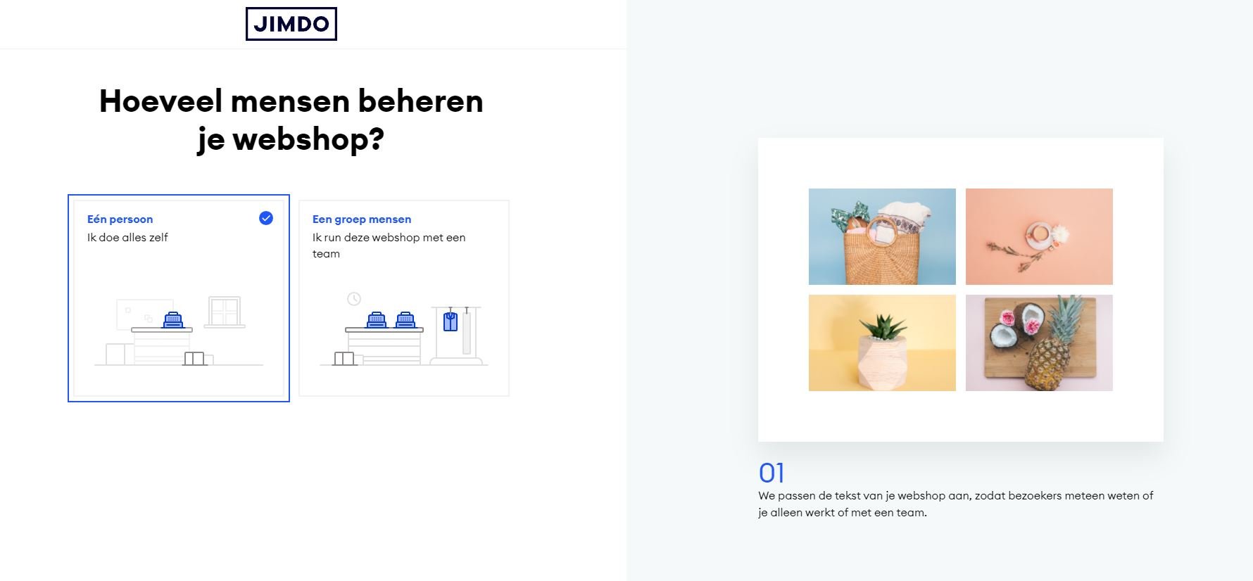 Wanneer je een account aanmaakt bij Jimdo wordt je in zo'n 10 stappen en keuzes door het startproces geloodst voor het beginnen van je website. Of je bijvoorbeeld alleen werkt, of je nationaal, lokaal of internationaal wil verkopen, of je fysieke producten hebt en waar je verkoopt. Naar aanleiding van de invulling van jouw antwoorden wordt er al een concept webshop voor je opgetuigd.