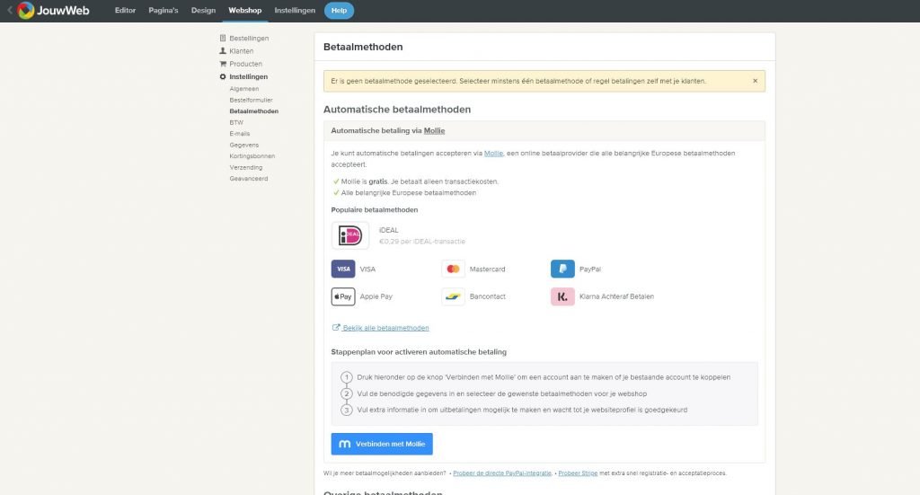 Het is natuurlijk ook van belang welke functies je kan toevoegen aan je website. 1 daarvan is de webshop module. Ga je met de webshop module aan de slag bij JouwWeb? Dan is het mogelijk om de iDeal functie en andere betalingen te koppelen, bijvoorbeeld via Mollie.