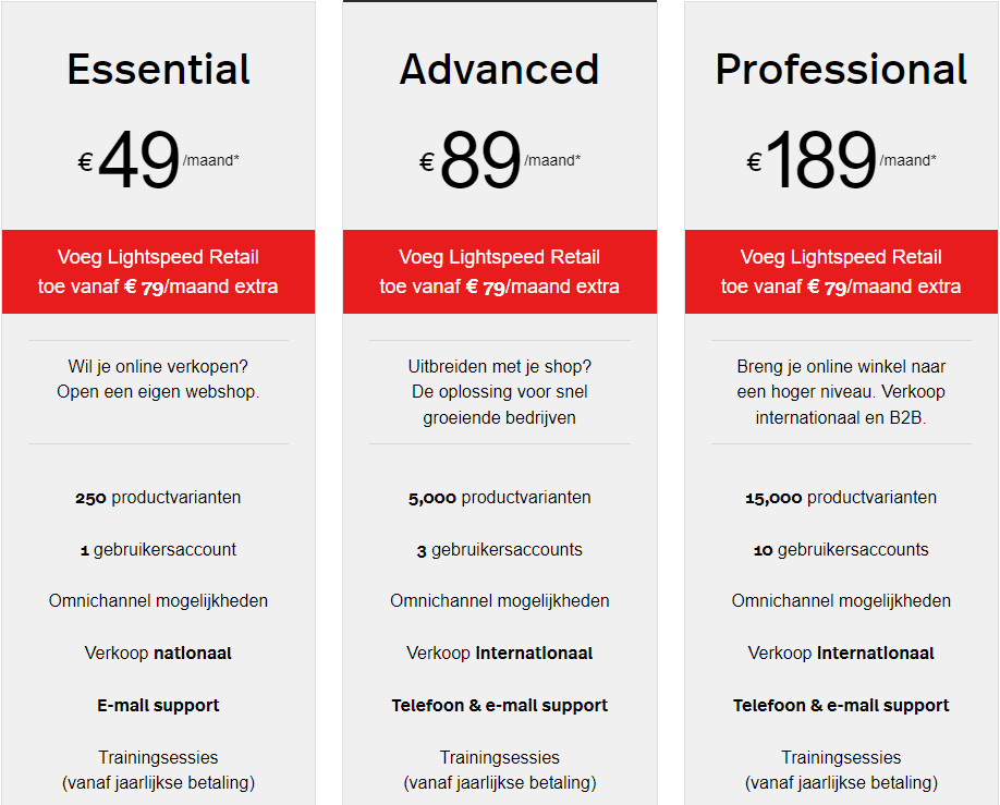 - De prijs is het grootste nadeel, Lightspeed webshops starten vanaf €49 per maand en afhankelijk van je wensen kan dit verder oplopen. Dat is iets duurder dan concurrenten als Shopify.