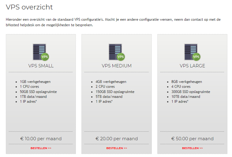Er zijn 4 standaard oplossingen bij bHosted voor VPS, mocht je een andere samenstelling van je VPS wensen dan kan je contact opnemen met de helpdesk en met hen afstemmen waar je naar op zoek bent.