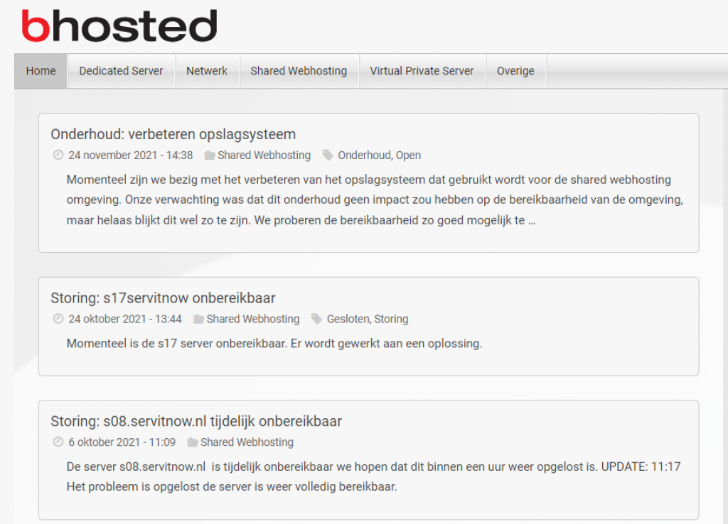 Ben je benieuwd of er een storing is bij bHosted? Dan kun je dat zien op status.bhosted.nl, prettig dat dit zo transparant is geregeld.