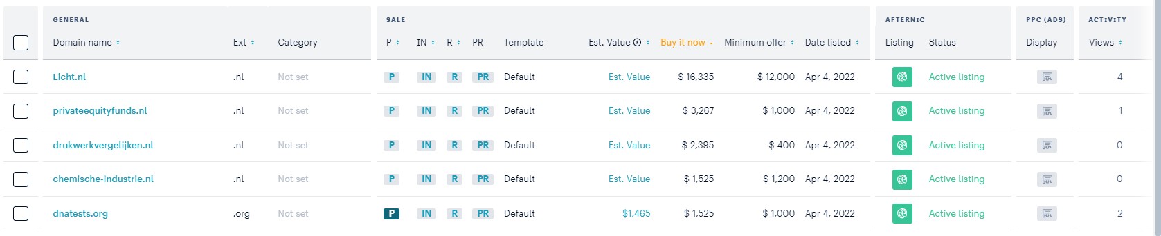 Als je de domeinen ‘echt' kwijt wilt dan moet je niet te hoog inzetten, de prijzen die je in gedachte hebt voor de verkoop zijn vrijwel altijd te hoog, wij hebben bijvoorbeeld deze grote namen nu te koop staan, zijn die van jou beter of vergelijkbaar? Zit er al traffic op? (Dat maakt de website duurder) Als je wilt verkopen: Zet de prijzen laag. Wil je jaren wachten en soms één verkoop pakken, mik dan iets hoger met de prijs.
