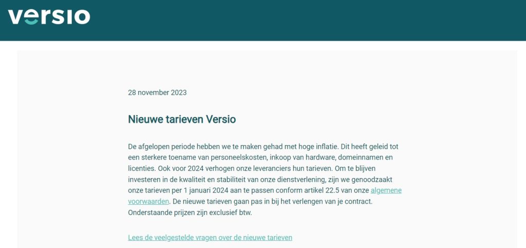 Stel je bent op 10 Januari 2023 begonnen met het hosten op Versio met een basis pakket en een .nl domein, dan betaalde je voorheen: € 40,99 (wat kortingen daargelaten) en dan betaal je vanaf 1 januari, dus binnen één jaar € 138,87. Dat is een stijging van 238% binnen één jaar!