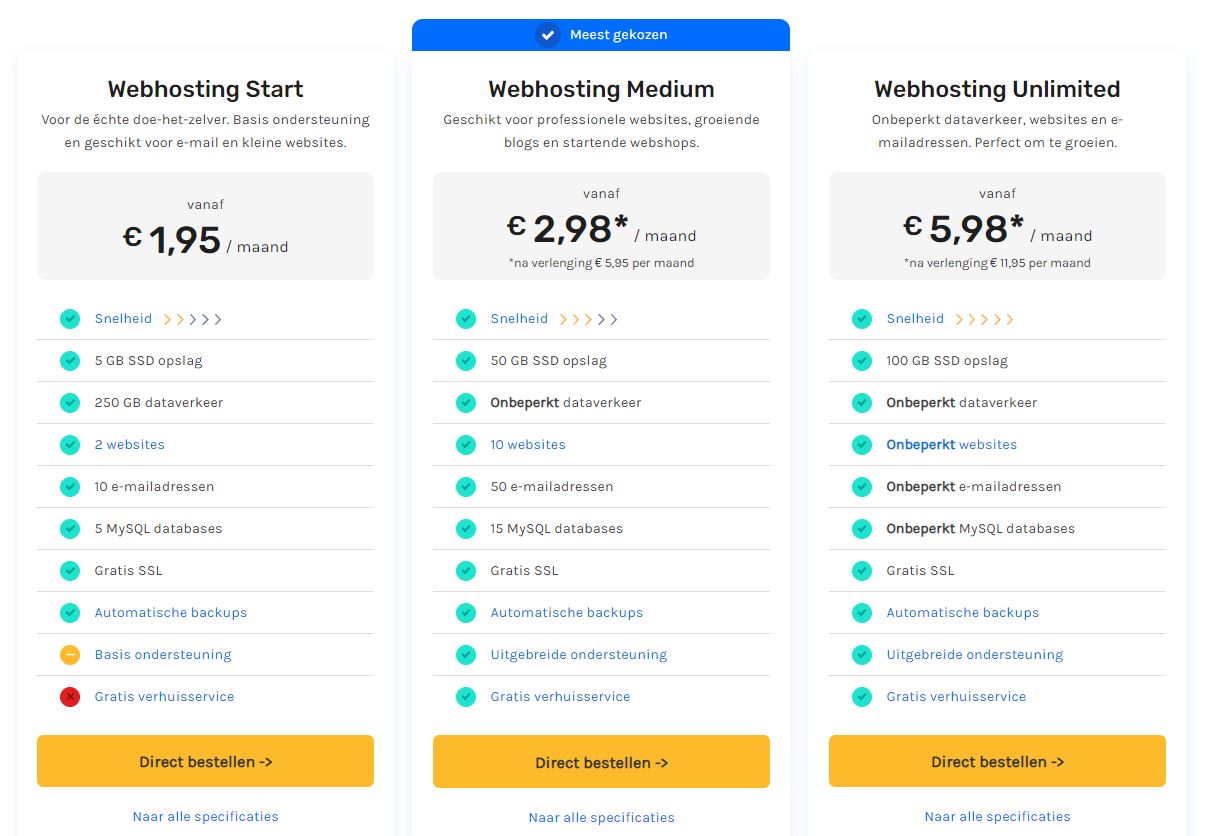 Er zijn 3 hosting pakketten waar veel mensen voor zullen gaan. Hiervoor worden de onderstaande maandelijkse kosten gehanteerd. Deze pakketten zijn beschikbaar voor (shared) webhosting, WordPress hosting en WooCommerce hosting. Er zijn ook Managed WooCommerce en Managed WordPress oplossingen – die zijn iets duurder. Je krijgt daar dan wel o.a. automatische backups en updates voor terug.