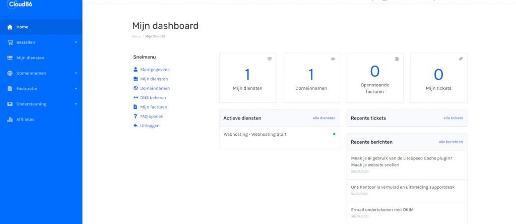 cloud86 dashboard – via hier kan je je domeinen en diensten beheren en vervolgens inloggen in Plesk (Hosting software) waarmee je je verdere instellingen per domein kan regelen