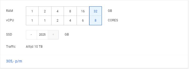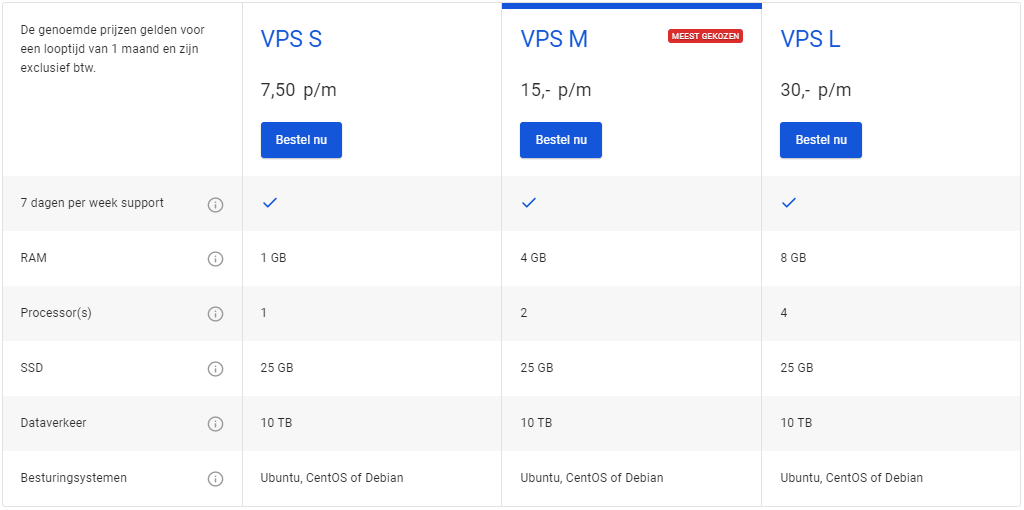 | Hostnet VPS | Ongeveer €19 tot €390 per maand (inclusief BTW). |