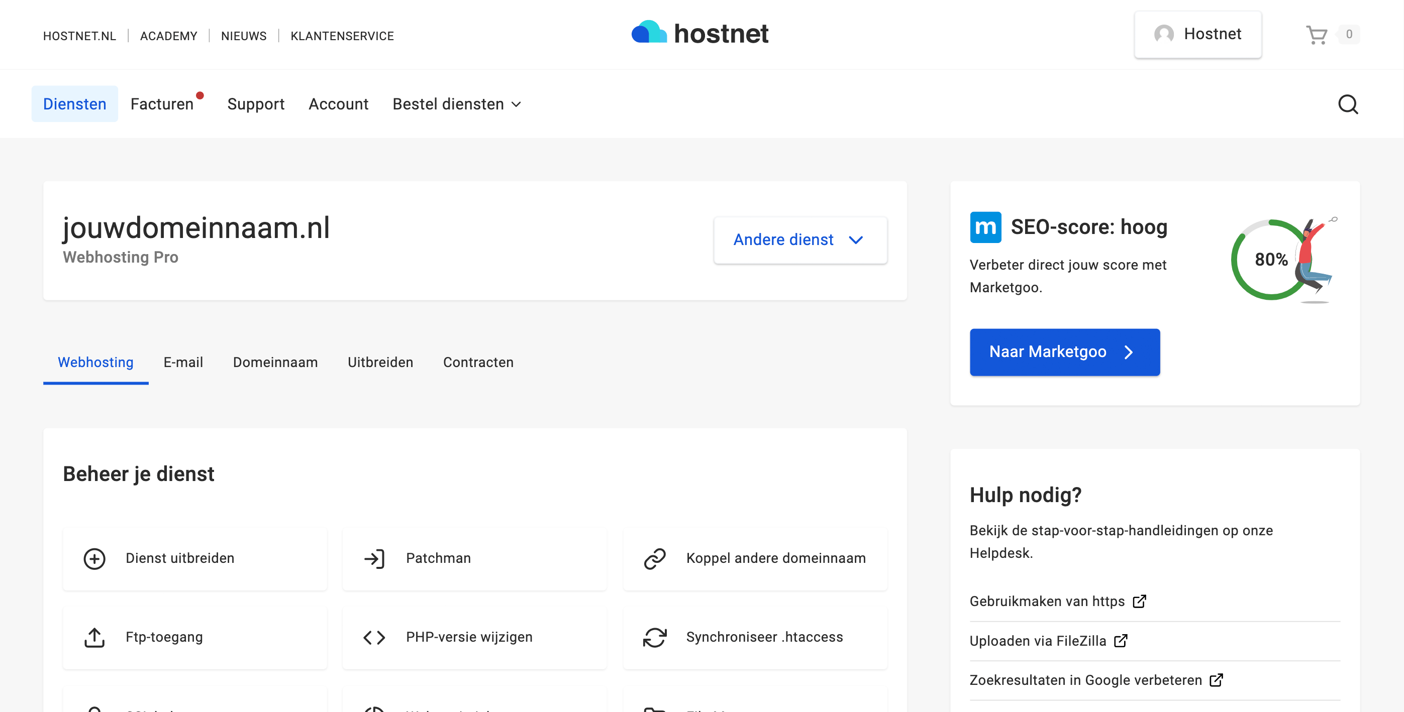 Hostnet heeft een aantal zaken waar ze ten opzichte van andere hosting bedrijven uitspringen. Ook het eigen dashboard is wat simplistischer dan bij andere partijen, wel kan je vanuit hier genoeg beheren. Zoals bijvoorbeeld php instellingen en krijg je meteen tips over hoe je scoort op SEO gebied. Hostnet is verder redelijk recht toe recht aan: de beste service die ze hebben is de klantenservice, zonder dat dit cynisch is bedoeld.