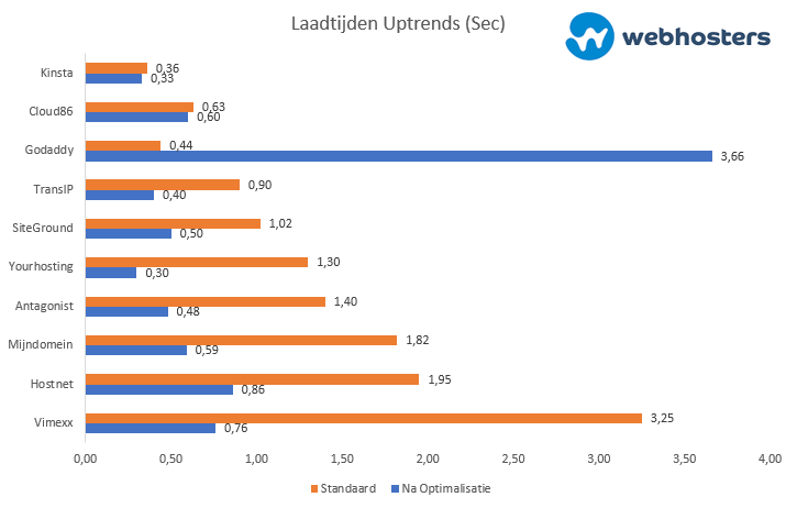 In uitgebreide snelheidstests van ReviewSignal (2019) en Webhosters (2020) komt de hosting van Kinsta als snelste naar voren. Het betreffen hier enkel tests van providers waar een WordPress website is gehost.