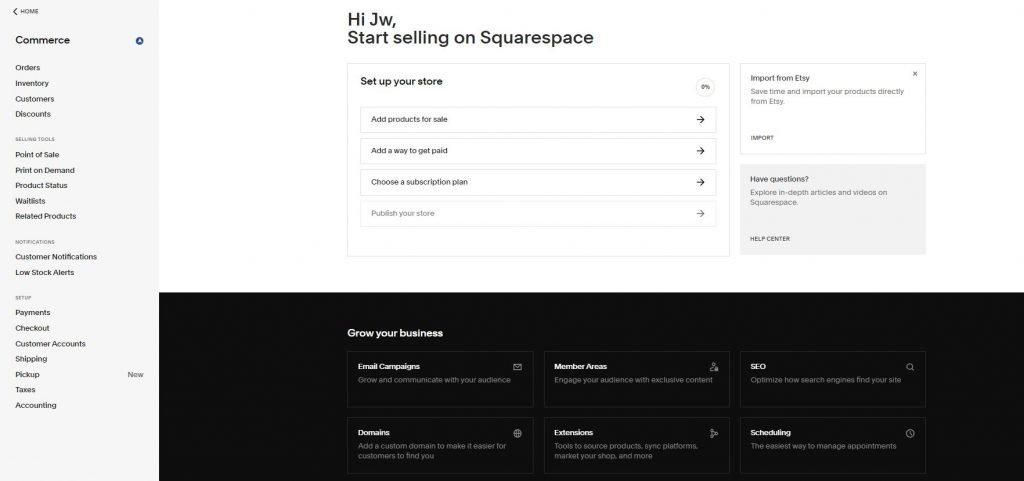 SquareSpace biedt een sitebuilder aan die ook geschikt is als webshop builder met de ‘Commerce’ functie.
