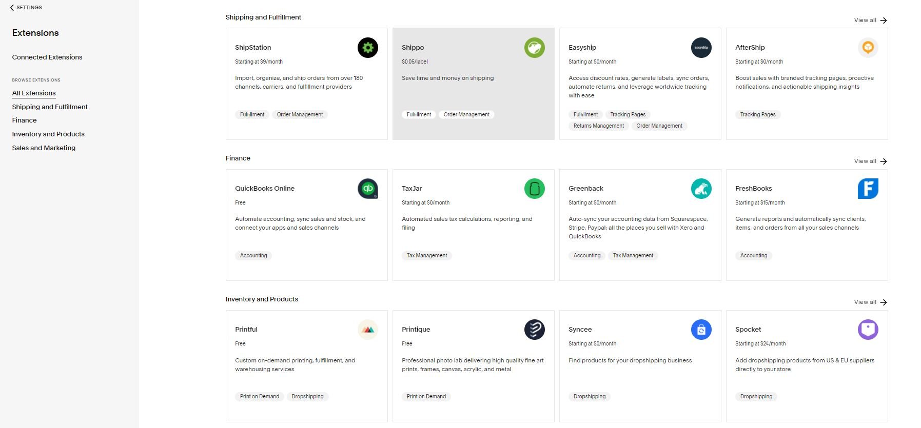 Het is natuurlijk ook van belang welke functies je kan toevoegen aan je website. Ook aan extensies geen gebrek bij SquareSpace. De extensies of plugins, hoe je ze ook wil noemen, vind je onder Settings > Extensions. Hier kan je onder meer integraties vinden voor je fulfilment, verzending, dropshipping (Spocket), boekhouding en onder meer je ‘verdere' SEO optimalisatie.