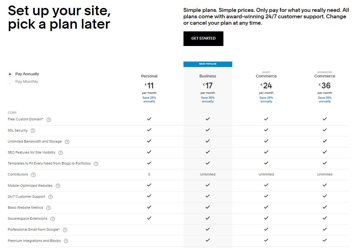 Het goedkoopste abonnement bij SquareSpace is het Personal pakket, dat is beschikbaar vanaf €11,- per maand. Vanaf het business pakket (€17) heb je webwinkel functionaliteiten er bij.
