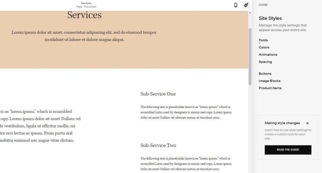 Dat het wel goed zit met hoe SquareSpace er uit ziet lees je wel in meer reviews. Maar het kan zijn dat je er een beetje je eigen draai aan wil geven; ook dit is niet moeilijk. Je gaat naar de pagina die je wilt aanpassen en daar kan je via ‘design' van alles aanpassen. Van de fonts, tot de kleuren, maar ook de content zelf is makkelijk te verschuiven met de drag and drop builder. Ook kun je zelf nog elementen zoals knoppen, plaatjes en producten toevoegen.