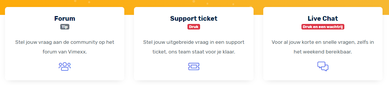 Vimexx biedt geen telefonische support maar is verder wel goed bereikbaar via de Livechat. Het is prettig dat ze tot later op de avond en in het weekend jouw vragen kunnen beantwoorden. Een handige feature is dat Vimexx van tevoren aangeeft hoe druk het is via de verschillende kanalen.