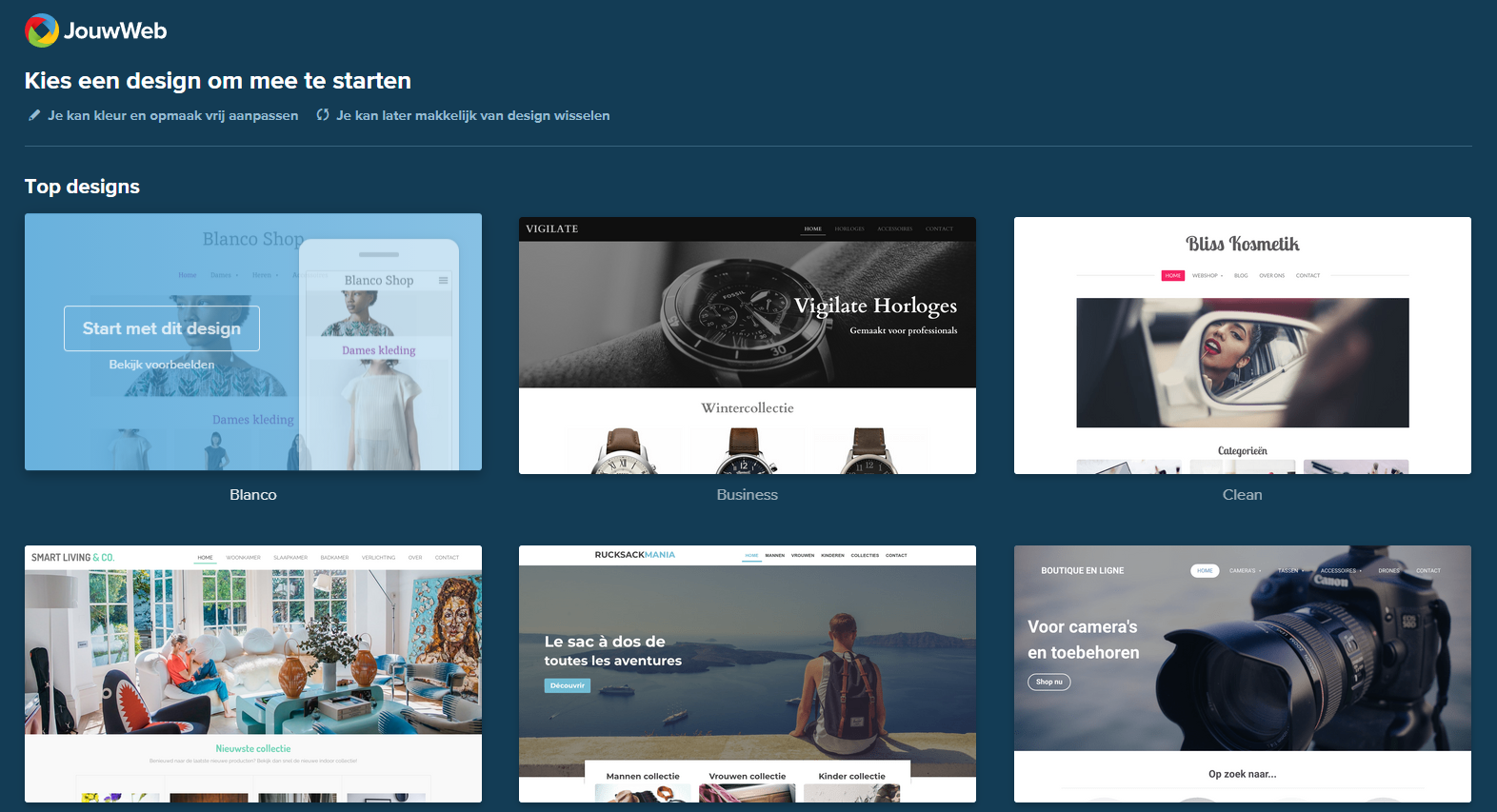 Een voorbeeld van de eerste stap in de Webshop Wizard van Jouwweb: